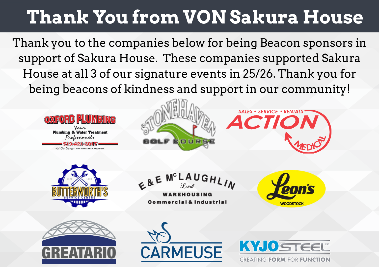 Each year, Sakura House hosts 3 signature events to help raise the necessary funds required to operate VON Sakura House. Sponsorship from local businesses allows our signature events is an integral part of each of these events. We want to share a thank you to the following businesses who supported all three of our events in our 2025/2026 event season. Thank you for being Beacons of kindness and support in Oxford County and beyond!
