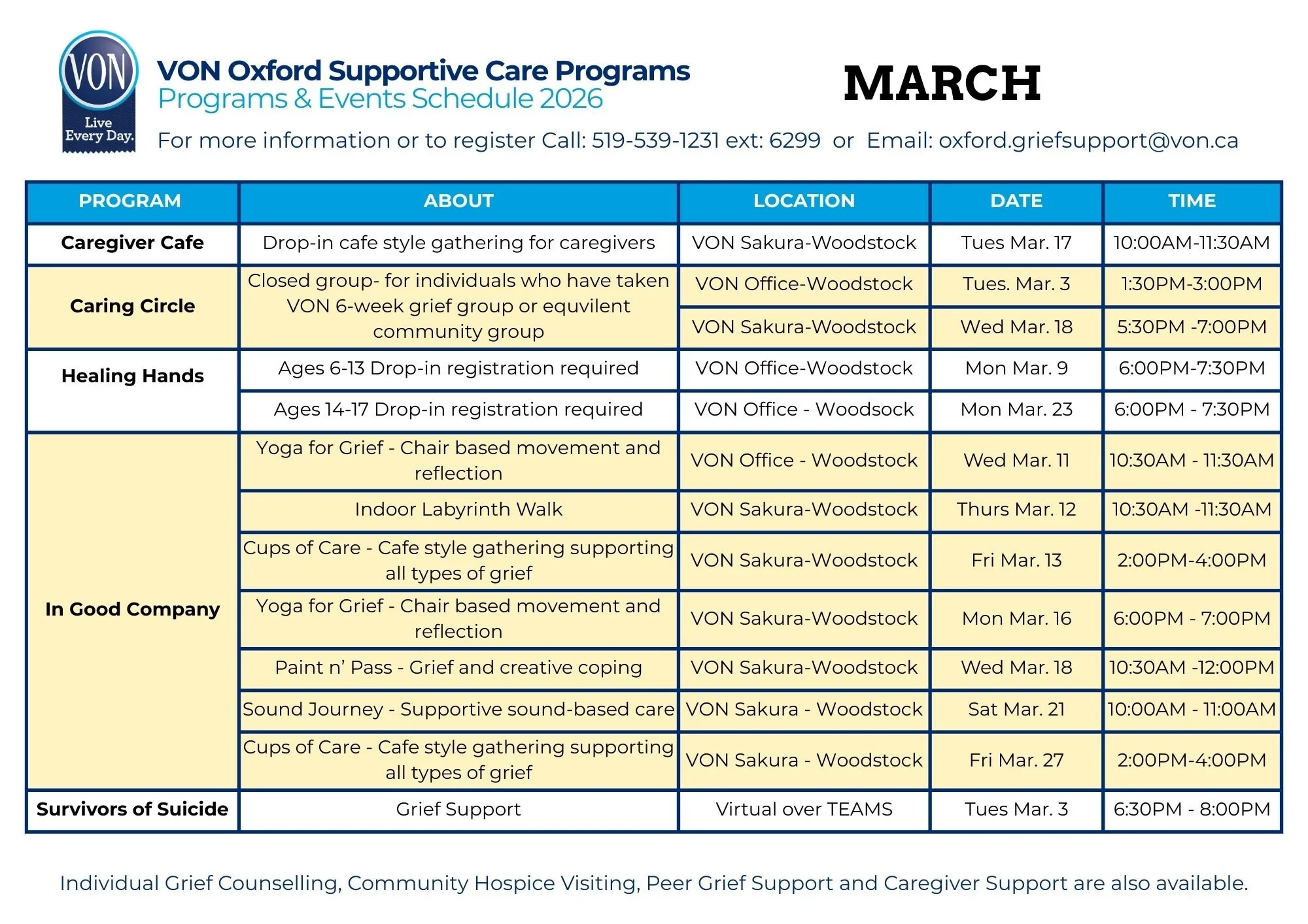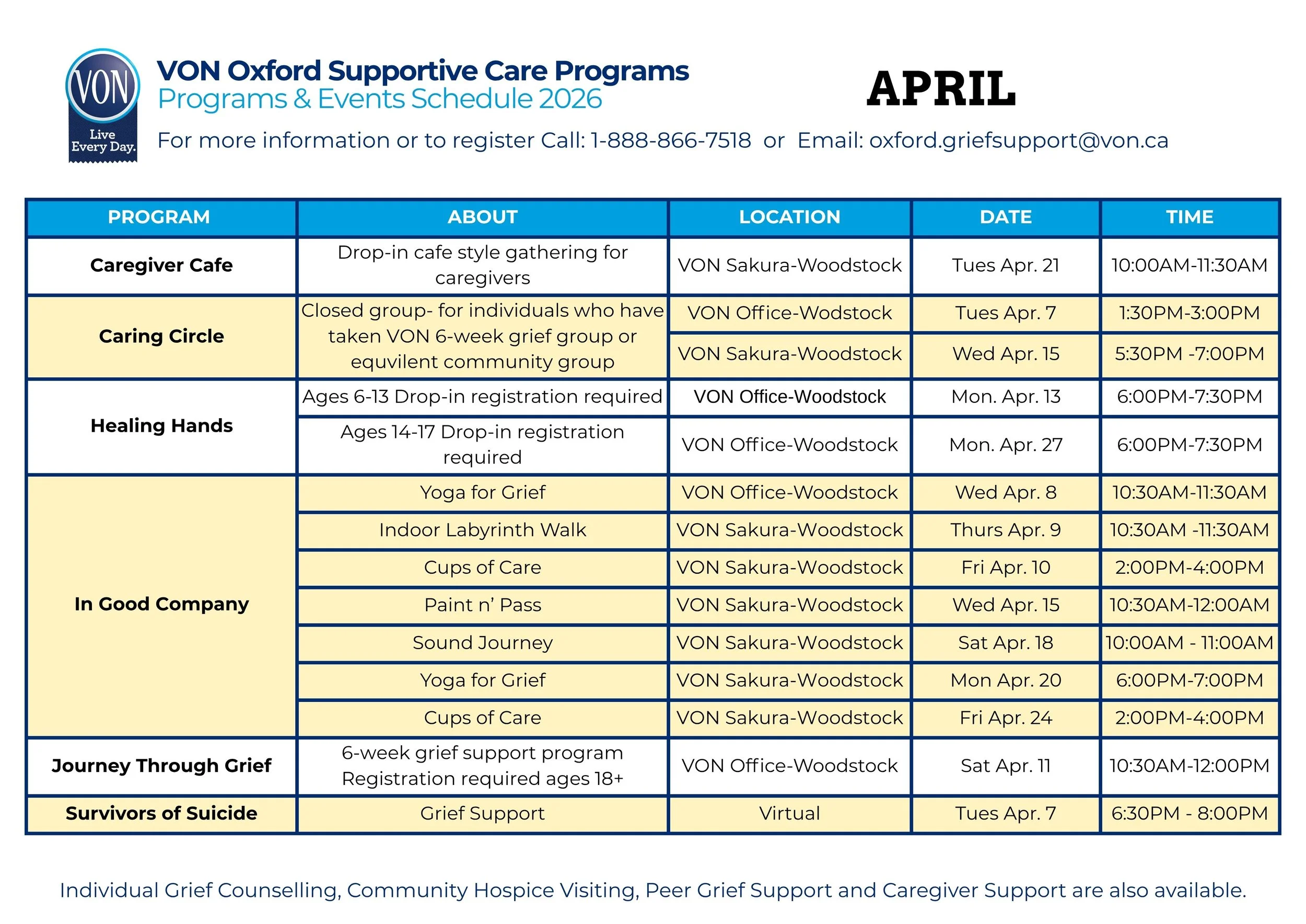 For access to these programs please contact our Program Coordinator at 519-539-1231 ext. 6299 or email oxford.griefsupport@von.ca